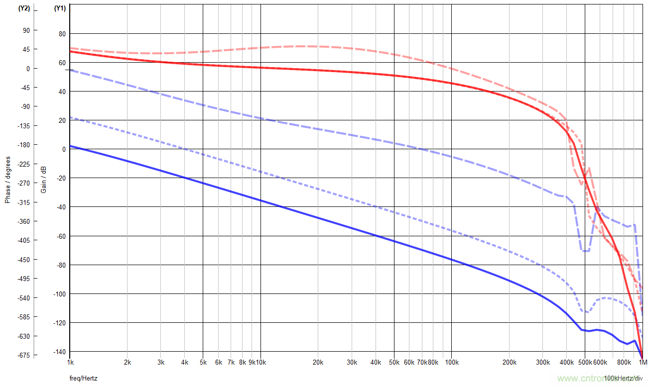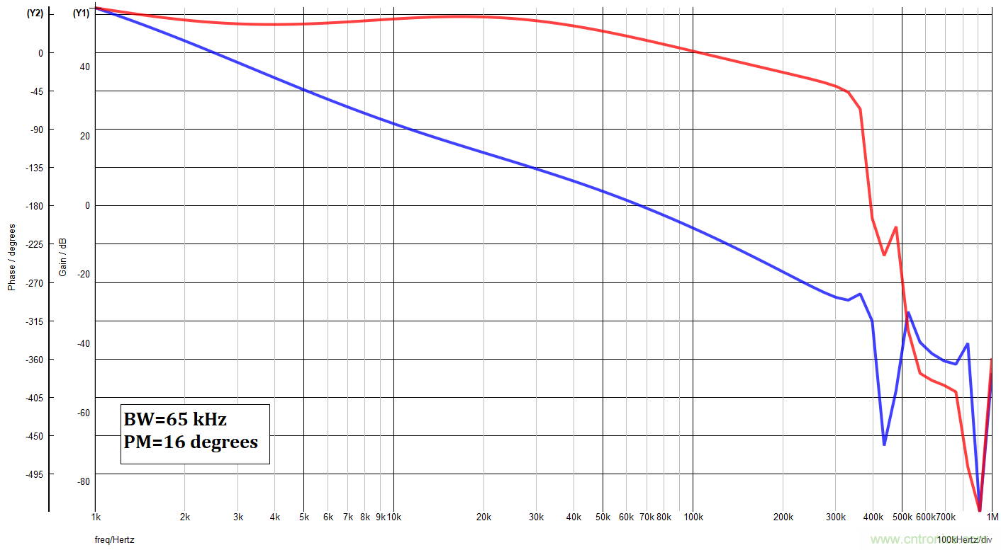 從圖4中可以看到,相位曲線(紅色)已經下降后,幅度曲線(藍色)才達到0dB。要獲得適當?shù)腜M和良好的穩(wěn)定性,必須在相位曲線開始下降之前出現(xiàn)幅度曲線的0dB點。