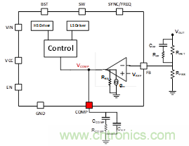 對于具有內部補償網絡的穩(wěn)壓器,COMP引腳不可用。因此,必須使用外部調節(jié)器來減小BW并提高穩(wěn)定性。而限制帶寬的最有效方法是在反饋引腳上串聯(lián)一個電阻(稱為FB串聯(lián)電阻)。