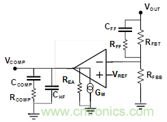 開關穩(wěn)壓器常用的補償網絡有兩種:II型和III型。II型補償網絡采用零極點集來實現(xiàn)所需的BW和PM。為進一步改善穩(wěn)壓器的瞬態(tài)響應,我們采用III型補償網絡。III型補償網絡增加了一個額外的零極點集,這將有助于實現(xiàn)更高的BW和/或更高的PM。圖2顯示了III型補償網絡原理圖。