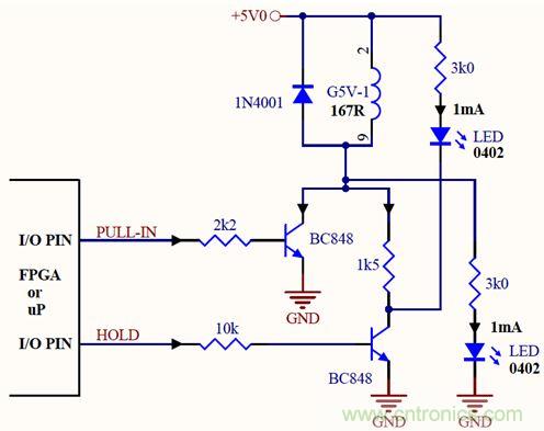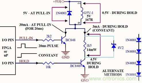 在HOLD晶體管的集電極和繼電器線圈之間是一個(gè)限流/降壓元件,如電阻、穩(wěn)壓二極管或者是二極管串。這些元器件的耗散功率都很小(在10mW至25mW之間)。