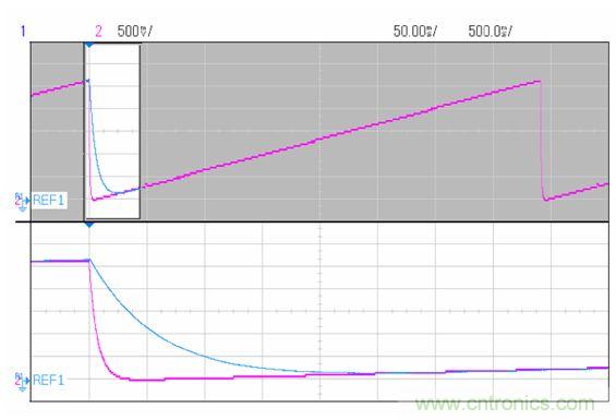 圖5:基于6位PWM的DAC測量輸出;藍線:圖1方案(穩(wěn)定時間160ms);紫線:圖3方案(穩(wěn)定時間20ms)。