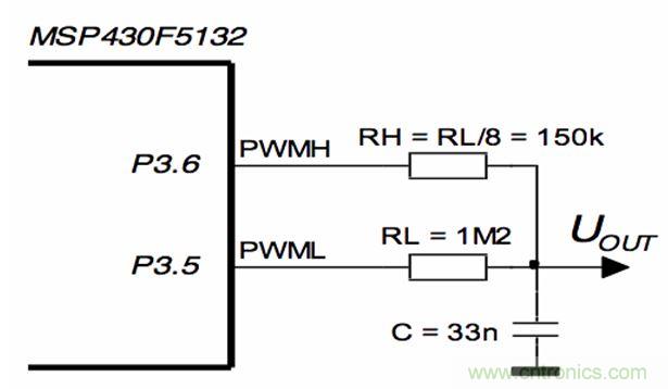 RC低通濾波器濾除掉非直流信號,得到的便是平均信號UOUT。如果PWM信號的周期T為63個時鐘周期,UOUT將會是64個離散DC值之一。(0 到 63,6位分辨率。)