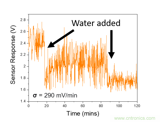 與之前的情況類似,該設(shè)備可以與arduino微控制器接口,而無需額外的硬件或外部電源。此外,該設(shè)備的測(cè)量噪聲水平顯著低于電導(dǎo)率傳感器的先前情況,僅為0.01 V / min。