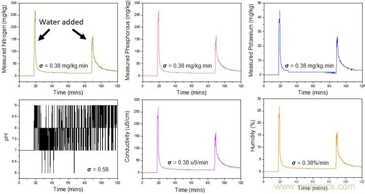 這樣,它可以很好地表征土壤,從而能夠估算出所用肥料的數(shù)量,質(zhì)量和濕度。但是,當(dāng)我們?cè)谔砑尤魏嗡皽y(cè)試干燥的土壤樣品時(shí),氮,磷,鉀,電導(dǎo)率和濕度傳感器提供的響應(yīng)信號(hào)為0,而pH設(shè)置為7。用250 mL的土壤澆水后,傳感器開始發(fā)送不同土壤參數(shù)的讀數(shù)。獲得了信號(hào)的初始峰值,并且值穩(wěn)定在特定值上,當(dāng)土壤再用250毫升第二次澆水時(shí),該值會(huì)略有增加。以下是在澆灌土壤樣品之前和之后從這些組件獲得的值,以及信號(hào)穩(wěn)定后的信號(hào)噪聲(σ)。