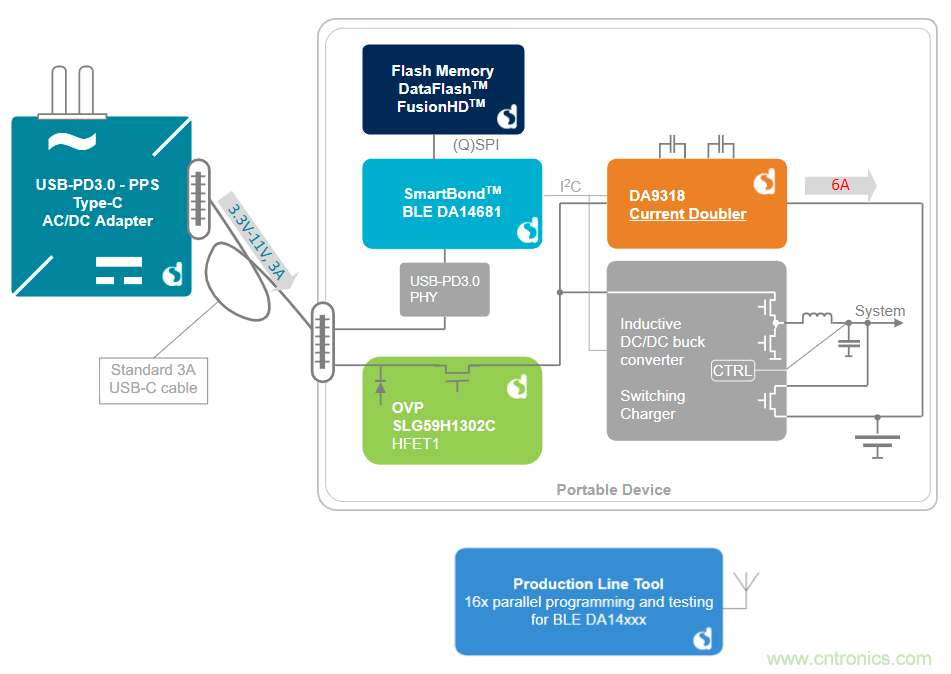 當(dāng)便攜式設(shè)備與支持USB-PD3.0規(guī)范中PPS(可編程電源)功能的USB Type-C兼容電源適配器配對時,支持USB Type-C PPS的電源適配器與便攜式設(shè)備之間的雙向通信,可以將充電路徑從通過感應(yīng)式主充電器的常規(guī)便攜式電源適配器固定電壓水平充電,改為通過電容式電流倍增器(DA9318)的新型快速充電器。