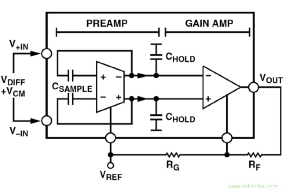 前置放大器的共模輸出保持在基準(zhǔn)電位VREF。當(dāng)采樣電容的底板連接到前置放大器的輸出端時,輸入信號共模電壓將被拉升至放大器的共模電壓VREF。通過這種方式,采樣電容達(dá)到與前置放大器相同的共模電壓。剩余的差分信號出現(xiàn)在增益放大器上,從而刷新保持電容的信號電位,如圖2所示。增益放大器會調(diào)理存儲于保持電容CHOLD上的更新信號。