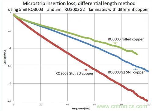 銅箔表面粗糙度及其變化也會影響高頻微帶電路的插入損耗。較粗糙的銅箔表面會導(dǎo)致較高的導(dǎo)體損耗并最終導(dǎo)致更高的插入損耗。插入損耗還取決于電路基板厚度,其中較薄的電路比較厚的電路更容易受銅箔表面粗糙度的影響。例如,對于在相同介質(zhì)材料上制造的電路,比較具有不同銅箔表面粗糙度和不同厚度的電路,使用光滑和粗糙銅箔的薄電路之間的插入損耗差異比使用相同銅箔的厚電路之間的插入損耗差異更顯著。在使用5mil厚度RO3003材料的電路的情況下,使用光滑壓延銅和使用粗糙ED銅的電路在25GHz下的插入損耗差為0.35dB / in。對于類似的比較,使用20mil 厚度的RO3003層壓板,粗糙的ED銅和光滑的壓延銅的電路插入損耗差為0.10 dB / in。這表明較薄的電路比厚的電路受銅箔表面粗糙度差異的影響更大,而大多數(shù)毫米波電路是需要選擇相對薄的電路材料的。