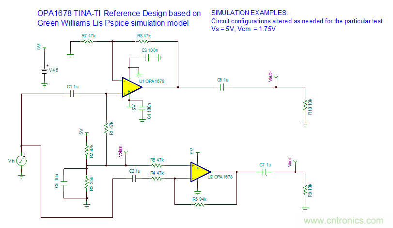 圖 4 使用OPA1678實(shí)現(xiàn)的單端轉(zhuǎn)差分信號電路