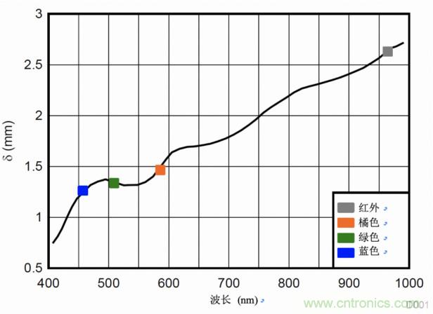 圖1:顯示一系列不同波長(zhǎng)光源的光學(xué)穿透深度(δ)
