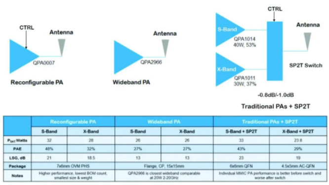 與寬帶放大器相比,可重新配置 PA 的優(yōu)勢(shì)更明顯。在寬帶放大器設(shè)計(jì)中,負(fù)載阻抗通常設(shè)計(jì)為低于最佳負(fù)載目標(biāo)值,以實(shí)現(xiàn)高輸出網(wǎng)絡(luò)帶寬。寬帶放大器降低了輸出功率和功率附加效率 (PAE)。因此,合成最佳負(fù)載阻抗的能力是可重新配置 PA 設(shè)計(jì)的關(guān)鍵。這最終能夠增加放大器場(chǎng)效應(yīng)晶體管 (FET) 外圍,從而在熱限制范圍內(nèi)最大限度地提高輸出功率。這些設(shè)計(jì)原理已在 Qorvo 的新產(chǎn)品 QPA0007** 中得以實(shí)現(xiàn)。QPA0007 是一款可重新配置的 30 W S/X 頻段功率放大器,采用了 Qorvo 150 nm 柵極長(zhǎng)度 GaN HEMT 工藝技術(shù) (QGanN15)??芍匦屡渲梅糯笃髋c寬帶和傳統(tǒng)多頻段方法之間的比較如圖 1 中所示。