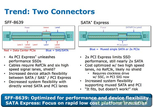 既然PCI Express可以,為什么SATA不可以?帶著這樣的思路,早在2011年下半年,一種新的理念被提了出來,叫做SATA Express。如今經(jīng)過各方討論和完善,SATA Express正在逐步成型,現(xiàn)在正等待被SATA-IO批準使用,不出意外的話,今年年底將正式成為規(guī)范。其理念很簡單,概括來說,就是把SATA硬盤全部連接到PCI Express上去。