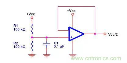 R1 和 R2 是等值的,通過電源允許的消耗和允許的噪聲來選擇,電容 C1 是一個低通濾波器,用來減少從電源上傳來的噪聲。在有些應(yīng)用中可以忽略緩沖運(yùn)放。