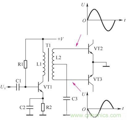 由電路中二次繞組L2和L3的同名端標(biāo)記可知,當(dāng)L2的上端信號(hào)為正半周期間,VT2導(dǎo)通、放大信號(hào),此時(shí)L3的下端信號(hào)為負(fù)半周,使VT3截止。