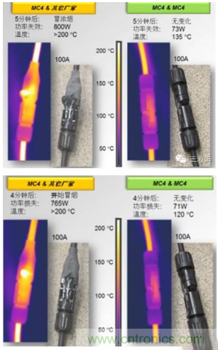 而與之形成鮮明對(duì)比的是MC4自身公母頭插合后的測試結(jié)果:除了溫度有初始的90℃升高到135℃及功率損失由69W升高到73W外,外觀并無明顯的變化。