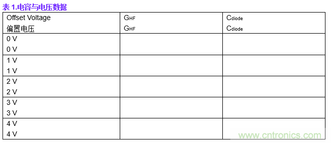 在表1剩余的部分,填入各偏置電壓值的GHF值,然后使用Cm值和步驟1中的公式來計算Cdiode的值。