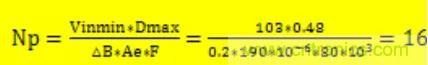 開關頻率選擇80K,最大占空比選擇0.48,全范圍DCM,則在最低輸入電壓Vdc下,占空比最大,電路工作在BCM狀態(tài),根據(jù)伏秒平衡,可以得到以下公式,