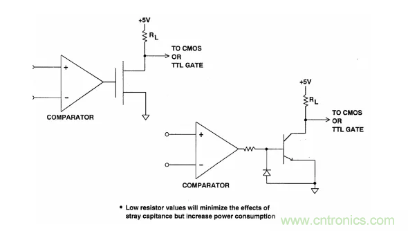 比較器的輸出端用于驅(qū)動特定邏輯電路系列,運算放大器的輸出端則用于在供電軌之間擺動。