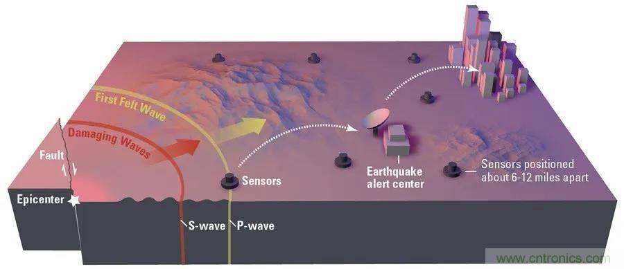 圖10.使用地震傳感器網(wǎng)絡(luò)的地震預(yù)警系統(tǒng),傳感器部署在相距6英里至12英里的多個(gè)位置。圖片由Erin Burkett (USGS)和(Orange County Register)制作。由美國(guó) 地質(zhì)調(diào)查局ShakeAlert項(xiàng)目提供35