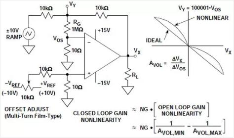 圖2右側(cè)的坐標(biāo)圖所示為VY與VX的關(guān)系圖。如果不存在增益非線性,則圖中所示應(yīng)為斜率不變的直線,AVOL按以下公式計(jì)算: