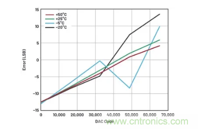 溫度變化對電子系統(tǒng)的精度有重要影響。雖然DAC的內(nèi)部增益和失調(diào)誤差通常相對于溫度來指定,但系統(tǒng)中的其他元器件可能會對輸出的總失調(diào)和增益產(chǎn)生影響。