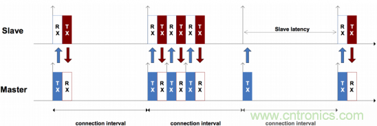 上圖還展示了BLE連接狀態(tài)的一個(gè)特性: slave latency, 即允許從機(jī)不響應(yīng)一些(可能是沒有收到的)數(shù)據(jù)包,而連接暫時(shí)能保持,不斷掉。因?yàn)殡p方的時(shí)間間隔約定還在,后續(xù)只要成功交互就可以恢復(fù)通信。