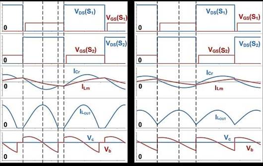 圖 3修改后的 CLL-MRC 關(guān)鍵波形:f sw < f r1(左);f sw > f r1(右)