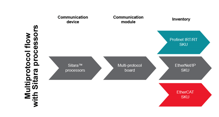此流程可能讓許多工廠設備制造商難以在其產品上啟用多種協(xié)議。而如今,可以使用支持多協(xié)議的器件(例如 Sitara 處理器)連接到多個協(xié)議。  Sitara 處理器(如 AMIC110)在單個設計中支持多種協(xié)議,克服了設計多協(xié)議環(huán)境的潛在挑戰(zhàn),提供了另一種方法來設計支持各種工業(yè)以太網協(xié)議的工廠設備。Sitara 器件憑借其優(yōu)勢,可簡化創(chuàng)建各種 SKU 的流程,如圖 2 所示。