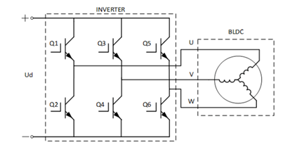 常見多旋翼無人機通常使用電子調速器作為電機的驅動部件,是一種比較常見的電機驅動裝置。電子調速器的主要通過PWM脈沖來實現(xiàn)三相激勵電流。典型的BLDC驅動如圖1.1所示。 Q1-Q6是6個MOSFET組成的直流轉交流的逆變電橋,每只管子在驅動信號激勵下,有序開通和關閉,形成交流驅動源。