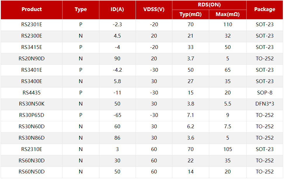 瑞森半導(dǎo)體低壓MOS管-Tench系列推薦如下產(chǎn)品選型:
