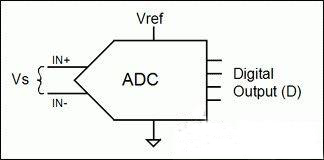 用于將傳感器信號數(shù)字化的ADC也是比例器件。無論其內(nèi)部架構(gòu)如何,所有ADC都是通過對未知輸入電壓與已知參考電壓相比較來工作的。轉(zhuǎn)換器的數(shù)字化輸出是輸入電壓與參考電壓的比值乘以ADC的滿量程讀數(shù)。考慮到內(nèi)部放大和設(shè)計的多樣性,還需要一個比例因子K。無論K值大小,只要ADC的配置未改變,K值都保持固定不變。公式4描述了一個普遍意義上的ADC (圖2)的數(shù)字讀數(shù)(D)和輸入信號(Vs),參考電壓(Vref),滿量程讀數(shù)(FS)以及比例因子(K)間的關(guān)系。