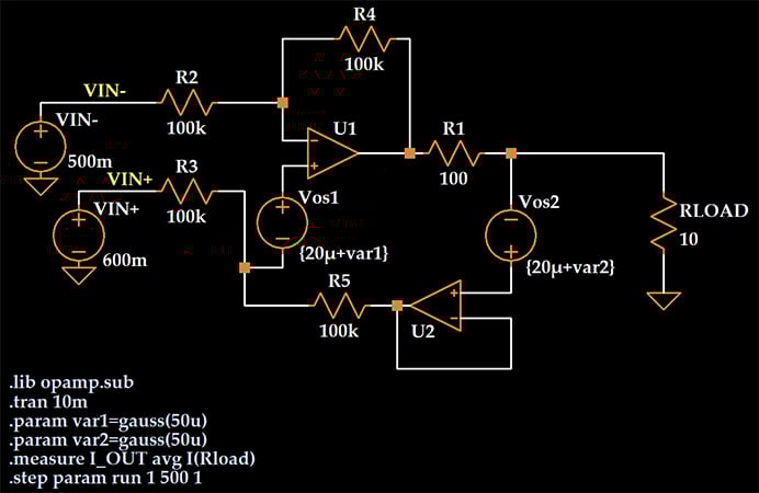 AD8606 數(shù)據(jù)表給出了 20 μV 作為典型的失調(diào)電壓值,因此我將其用作表示失調(diào)電壓的電源的標(biāo)稱值。傳遞給高斯函數(shù)的參數(shù)是隨機生成的數(shù)字的標(biāo)準(zhǔn)差。因此,我的失調(diào)電壓值定義為 {20μ + gauss(50μ)},表示均值為 20 μV、標(biāo)準(zhǔn)差為 50 μV 的高斯分布。