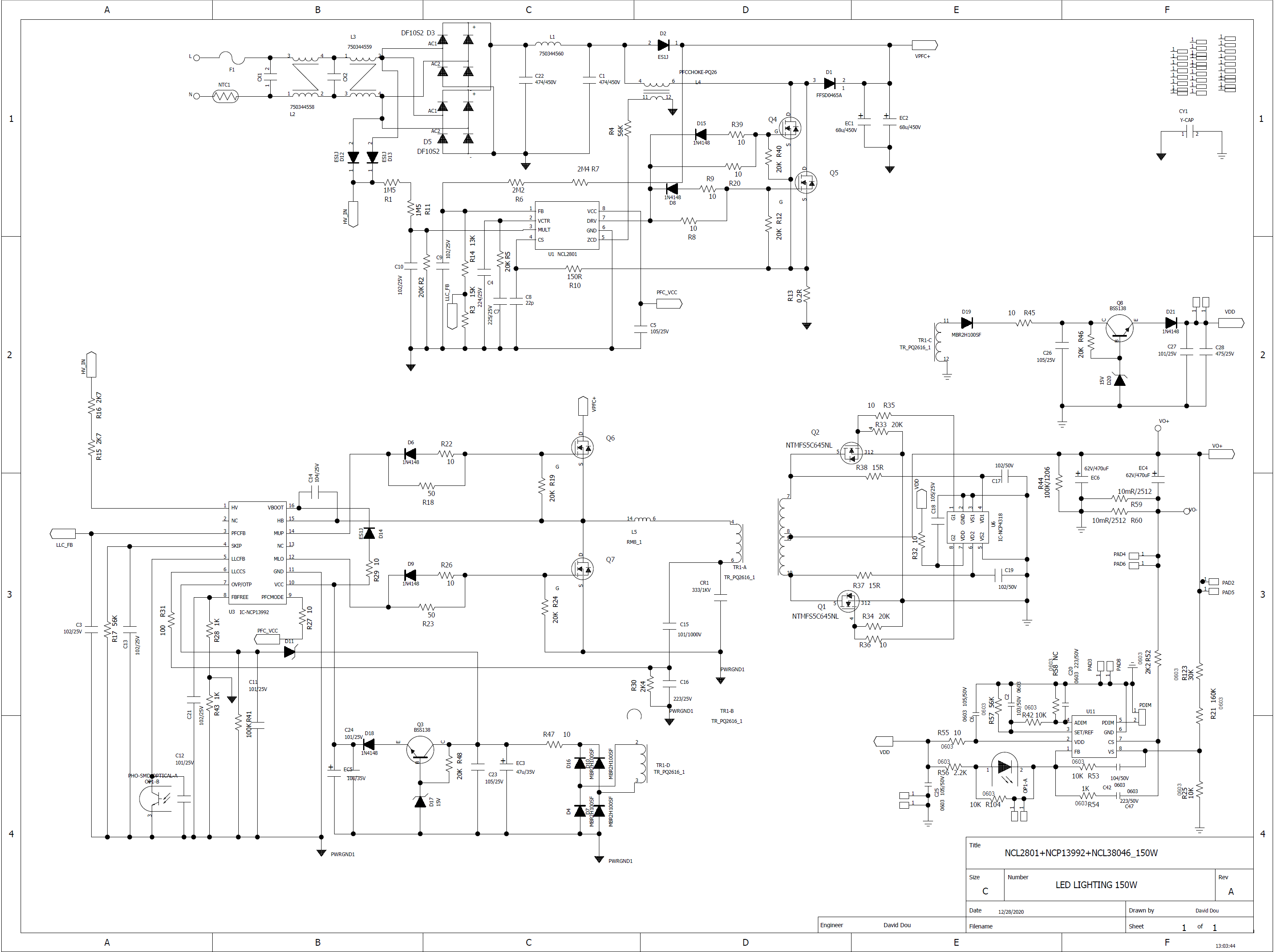 使用安森美的最新電流型LLC拓撲結構驅(qū)動芯片NCL30159,在NCP1399和NCP13992的基礎上,增加了原邊恒流功能,并對輕載時候的打嗝工作模式進行了優(yōu)化;