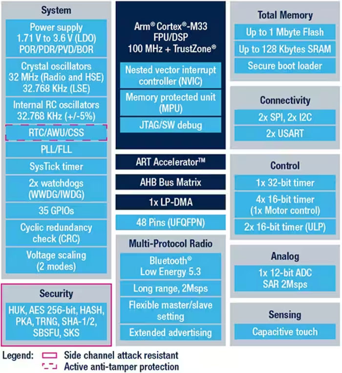 圖 1:STM32WBA52 的功能框圖顯示了集成 BLE 5.3 無線電、閃存和 SRAM 以及安全支持。(圖片來源:STMicroelectronics)
