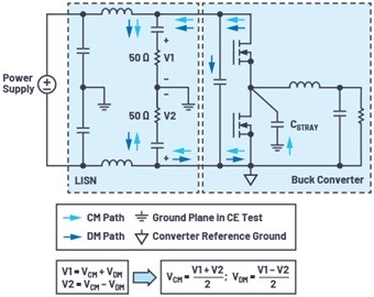 DM噪聲在電源線和返回線之間產(chǎn)生,而CM噪聲是通過雜散電容CSTRAY在電源線和接地參考平面(例如銅測試臺)之間產(chǎn)生。CSTRAY實(shí)際上模擬了降壓轉(zhuǎn)換器輸出端的開關(guān)噪聲寄生效應(yīng)。