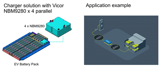 為了使800V的BEV能夠在400V的充電站充電,基于Vicor NBM9280并行解決方案的充電器,在冷卻液溫度為50°C時也能保持高性能。