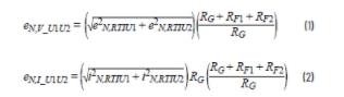 由U1和U2的增益和反饋電阻網(wǎng)絡(luò)(RF1、RF2和RG)引起的輸出噪聲為: