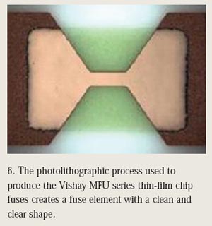 采用光刻技術(shù),可以與控制濺射薄膜層厚度相同的準(zhǔn)確度和精度對熔斷元件的長度和寬度施加控制。圖6顯示了如何采用光刻工藝制造Vishay的MFU系列薄膜芯片保險(xiǎn)絲,制成的熔斷元件具有整潔和清晰的形狀。