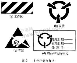 (2)張貼醒目的靜電敏感器件標(biāo)志,圖7是各種防靜電標(biāo)志。其中(a)是防靜電工作區(qū)的標(biāo)志,(b)和(c)是防靜電容器、元件架、運(yùn)輸車等器材上的標(biāo)記;(d)是經(jīng)防靜電處理的物品和場(chǎng)所的標(biāo)記;