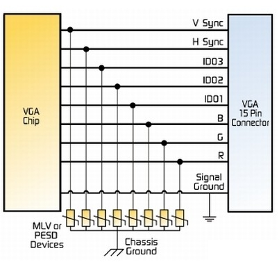 圖6. 低電容值MLV和PESD元件幫助保護VGA端口