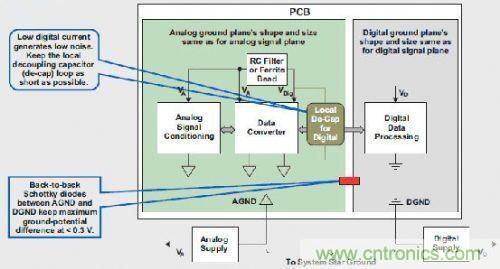 圖2所示電路靠VDig和DGND之間的去耦電容器來使數(shù)字瞬態(tài)電流隔離在小環(huán)路中。但是,如果數(shù)字電流足夠大,并且有組件在DC或者低頻下,則該去 耦電容器可能必須非常的大,而這是不實際的。VDig和DGND之間環(huán)路之外的任何數(shù)字電流,必須流經(jīng)模擬接地層。這可能會降低性能,特別是在高分辨率系 統(tǒng)中更是如此。圖3顯示了一種適用于強數(shù)字電流混合信號器件的替代接地方法。數(shù)據(jù)轉(zhuǎn)換器的AGND引腳連接至模擬接地層,而DGND引腳則連接至數(shù)字接地 層。數(shù)字電流也隔離于模擬接地層,但兩個接地層之間的噪聲卻直接作用于器件的AGND和DGND引腳之間。模擬和數(shù)字電路必須獲得有效的隔離。AGND和 DGND引腳之間的噪聲必須不能過大,否則會降低內(nèi)部噪聲余量,或者引起內(nèi)部模擬電路損壞。