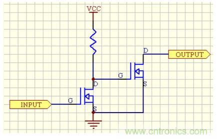 我們將圖1簡化成圖2的樣子。圖2中的開關(guān)受軟件控制,“1”時斷開,“0”時閉合。很明顯可以看出,當(dāng)開關(guān)閉合時,輸出直接接地,所以輸出電平為0。而當(dāng)開關(guān)斷開時,則輸出端懸空了,即高阻態(tài)。這時電平狀態(tài)未知,如果后面一個電阻負(fù)載(即使很輕的負(fù)載)到地,那么輸出端的電平就被這個負(fù)載拉到低電平了,所以這個電路是不能輸出高電平的。