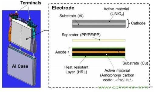 對(duì)于碰撞,總的思路是通過車身和電池包本身的結(jié)構(gòu)強(qiáng)度來進(jìn)行防護(hù),而在電芯層面,豐田是下了一番工夫研究,采用了“隔熱層”(Heat Resistant Layer,HRL)設(shè)計(jì)。HRL也被用來應(yīng)對(duì)電芯的內(nèi)短路風(fēng)險(xiǎn),因?yàn)殡娦镜膬?nèi)短路,目前整個(gè)系統(tǒng)層面是毫無應(yīng)對(duì)方案的。