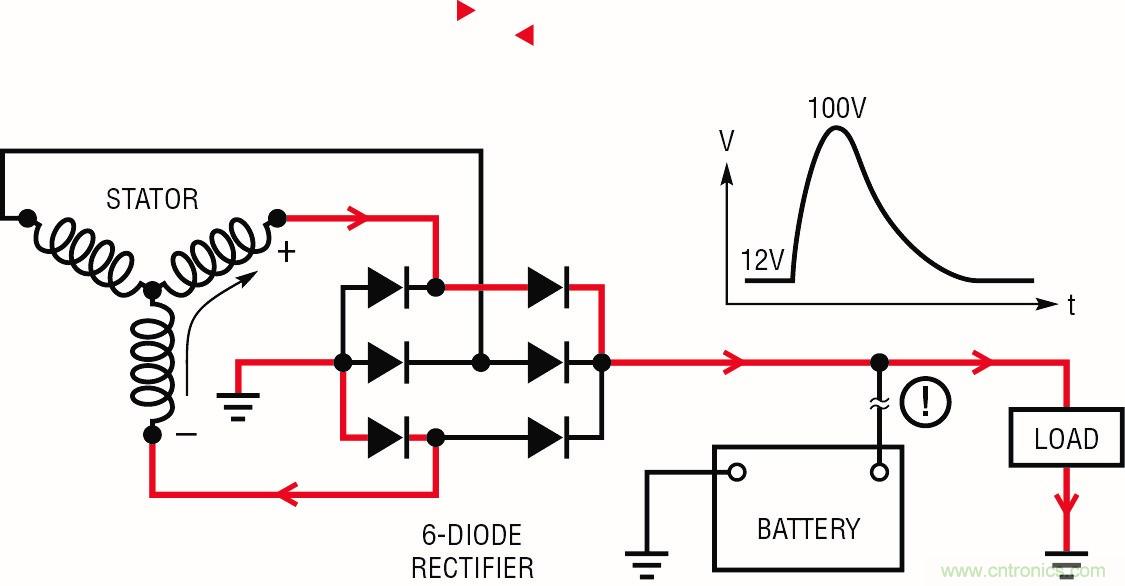 負(fù)載突降是最具挑戰(zhàn)性的電源瞬態(tài),因?yàn)檫@一瞬態(tài)事件中涉及很高的能量。當(dāng)交流發(fā)電機(jī)給電池充電,以及電池連接缺失時(shí),就發(fā)生負(fù)載突降事件。