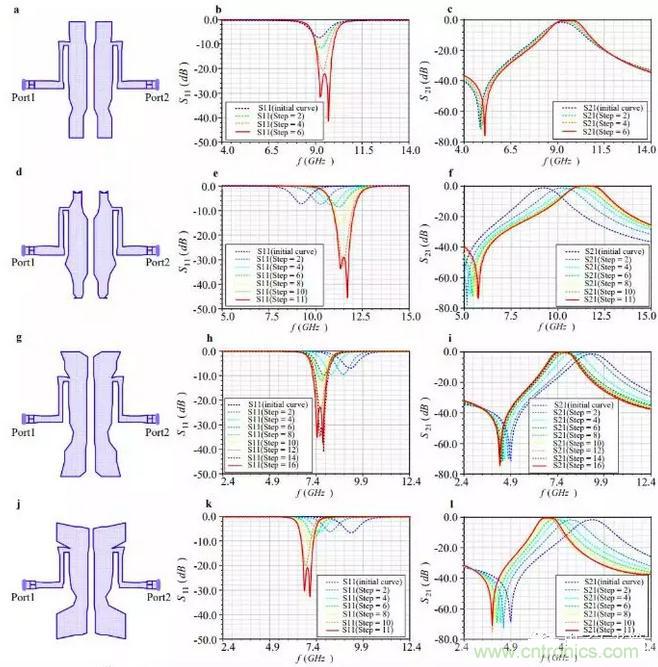 第二項任務(wù)和第三項任務(wù)的AI首先學(xué)會調(diào)整諧振器的長度,以達到移動中心頻率的目的,然后調(diào)整諧振器之間的耦合系數(shù),以減少通帶回波損耗,增加插入損耗,其設(shè)計過程如圖3(d-i)所示。