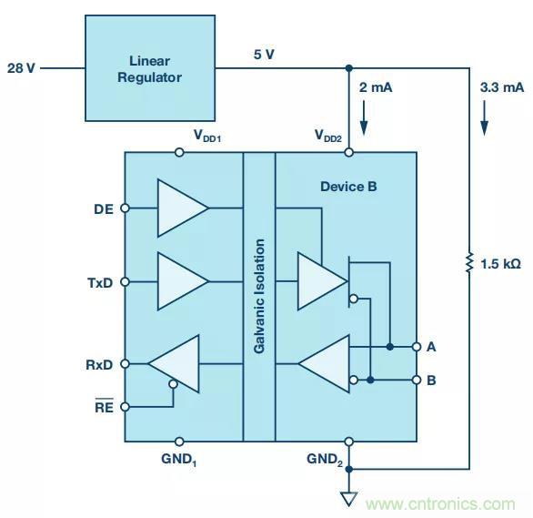 “更好”是一個(gè)定性術(shù)語,具體取決于所討論的參數(shù)。例如,當(dāng)涉及到速度、CMRR、PSRR時(shí),越高越好;當(dāng)涉及到失調(diào)電壓、漂移時(shí),越低越好;而您不需要太多工程知識(shí)就知道功耗總是越低越好。真的是這樣嗎?在這個(gè)特殊案例中,并非如此。舊收發(fā)器閑置狀態(tài)下在總線側(cè)消耗15 mA (典型值)電流,而新器件僅消耗 2 mA (最大值)。毫無疑問,新器件在數(shù)據(jù)上看起來更好。不幸的是,線性穩(wěn)壓器似乎失常了。