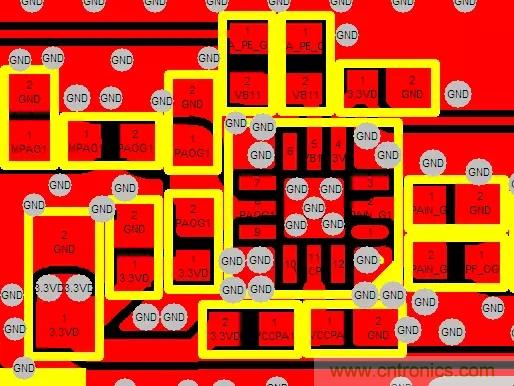 b) 在工藝允許的前提下,接地的大焊盤可直接蓋在至少 6 個接地過孔上(具體數(shù)量因 焊盤大小而異);