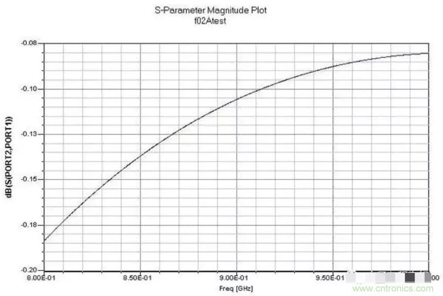由圖中可以看到,在800MHz-1GHz的范圍內(nèi),仿真的數(shù)據(jù)展示為小數(shù)點(diǎn)后一到兩位的數(shù)量級,0.35mm的損耗要比0.1016mm的線小一個數(shù)量 級,這是因?yàn)?.35mm的線寬在該板的層疊條件下其特征阻抗接近50Ω。因此間接驗(yàn)證了我們所做的阻抗計(jì)算(用線寬約束)是有一定作用的。