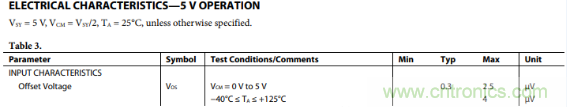 (1)變量為溫度,單位是μV/℃,表示輸入失調(diào)電壓的變化量與導(dǎo)致該變化的溫度變化量的比值。數(shù)據(jù)手冊提供的參數(shù)為測量溫度范圍內(nèi)的平均值,符號為ΔVOS/ΔT,或者 dVOS/dT。
