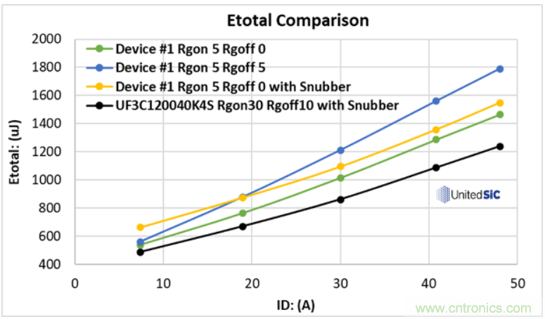 為了更好地理解整體效率,將Eoff和Eon一起添加了Etotal(圖6)。全速切換時(shí),緩沖器在18A以上時(shí)效率更高。對(duì)于以40A / 40kHz開關(guān)的40mΩ器件,使用RC緩沖器的高和低RG(關(guān))之間的損耗差為11W。總之,與使用高RG(關(guān))相比,緩沖器是一種將EMI和開關(guān)損耗降至最低的更簡(jiǎn)單,更有效的方法。