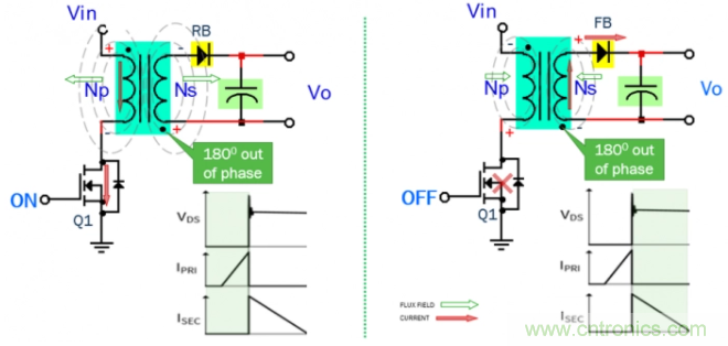圖3該圖顯示了電源開關(guān)處于打開狀態(tài)(左)和關(guān)閉(右)時(shí)的反激式操作。資料來源:安森美半導(dǎo)體